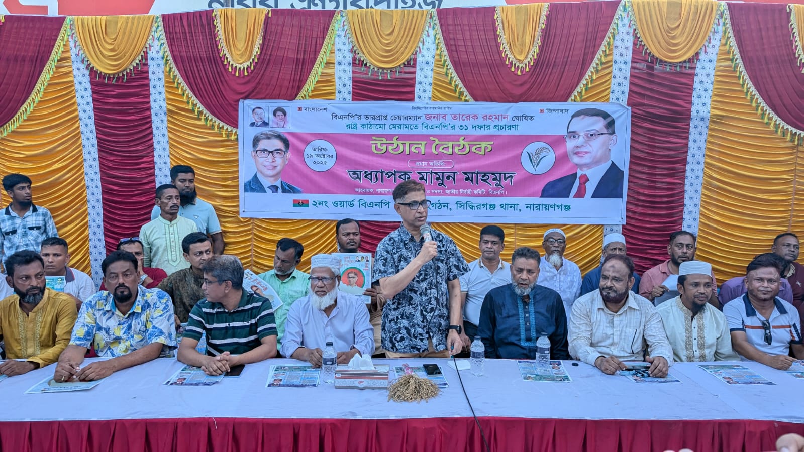 নারায়ণগঞ্জ জেলা বিএনপির আহবায়ক ও নারায়ণগঞ্জ-৩ ( সিদ্ধিরগঞ্জ ও সোনারগাঁ) আসনের এমপি পদপ্রার্থী অধ্যাপক মামুন মাহমুদ বলেছেন, ছাত্র জনতার প্রতিরোধের মুখে ফ্যাসিবাদের পতন ঘটেছে এবং বাংলাদেশে একটি নতুন সূর্য উদয় হয়েছে। আমার বিশ্বাস এই নতুন সূর্য বাংলাদেশের গণতন্ত্র প্রতিষ্ঠায় আমাদেরকে পথ দেখাবে। জাতি অধীর আগ্রহে একটি অবাধ সুষ্ঠ গ্রহণযোগ্য অংশ গ্রহণমূলক নির্বাচনের অপেক্ষা করছে। আপানারা জানেন স্বৈরাচার খুনি শেখ হাসিনা দেশের মানুষের টাকা ব্যাংক থেকে লুটপাট করে এস আলম গ্রুপের কাছে রেখেছে। সেই টাকা দিয়ে বর্তমানে খুনি হাসিনা দেশের পরিস্থিতি ঘোলাটে করার চেষ্টা করছে।