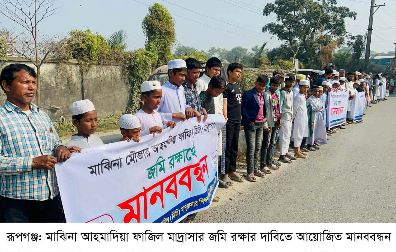 রূপগঞ্জ উপজেলার কায়েতপাড়া ইউনিয়নের মাঝিনা আহমাদিয়া ফাজিল মাদ্রাসার জমি ভূমিদস্যু ও জালিয়াত চক্রের হাত থেকে রক্ষার দাবিতে মানববন্ধন করা হয়েছে। ২২ডিসেম্বর সোমবার মুড়াপাড়া মঠেরঘাট এলাকায় মাদ্রাসার শিক্ষক, শিক্ষার্থী ও অভিভাবকরা এ কর্মসূূচি পালন করেন। মানববন্ধন পূর্বক আয়োজিত সভায় সভাপতিত্ব করেন মাদ্রাসা পরিচালনা কমিটির সদস্য মিল্লাত হোসেন।