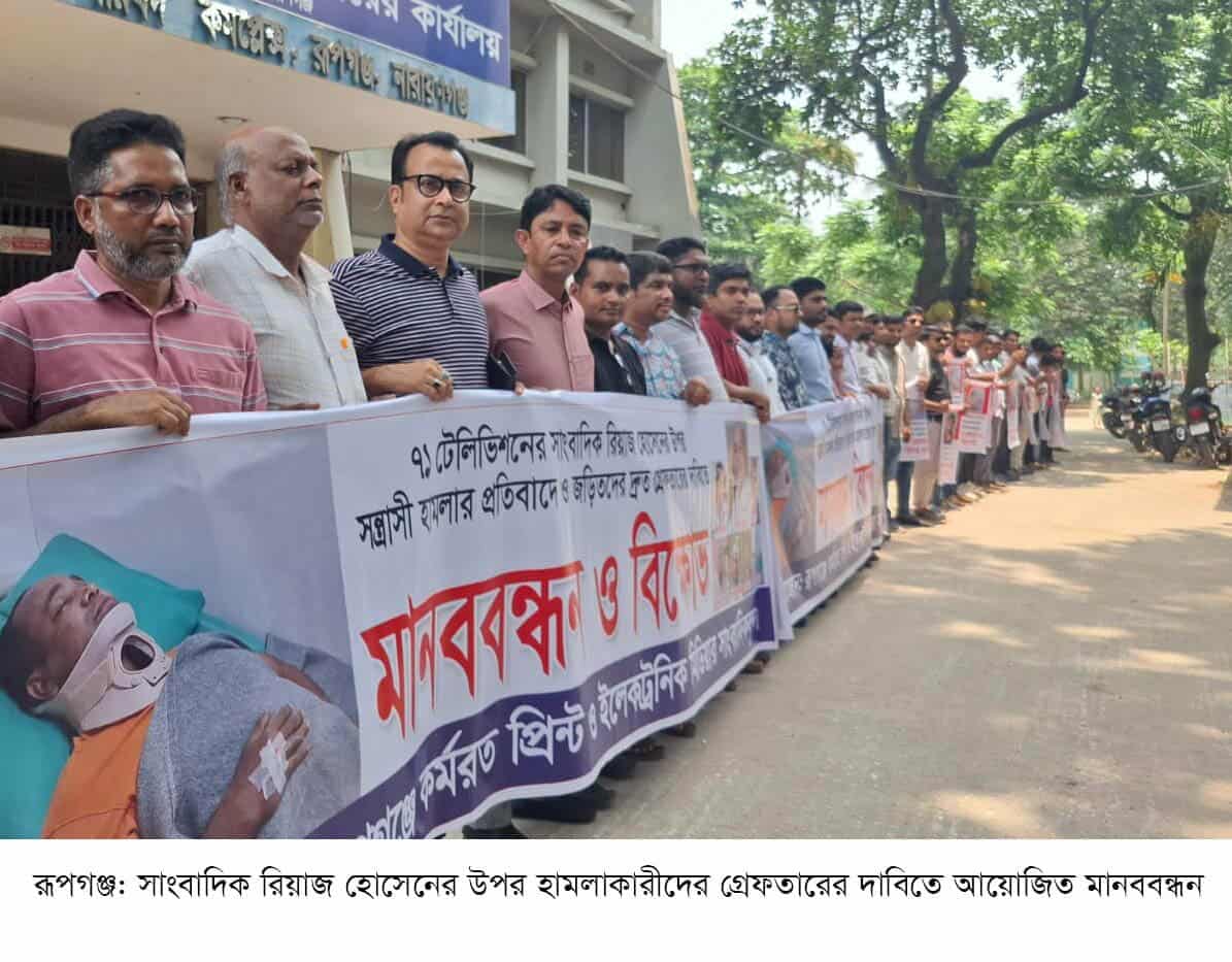 একাত্তর টেলিভিশনের রূপগঞ্জ প্রতিনিধি রিয়াজ হোসেনের উপর হামলাকারীদের গ্রেফতার ও শাস্তির দাবিতে মানববন্ধন ও বিক্ষোভ করা হয়েছে। মঙ্গলবার (১৩ মে) রূপগঞ্জ উপজেলা নির্বাহী অফিসারের কার্যালয়ের সামনে প্রিন্ট ও ইলেক্ট্রনিক মিডিয়ার স্থানীয় সাংবাদিকরা এ কর্মসূচি পালন করে।