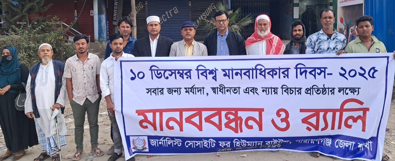১০ ডিসেম্বর বুধবার সকালে সিদ্ধিরগঞ্জ পুল এস.এম টাওয়ারের সামনে সবার জন্য মর্যাদা,স্বাধীনতা এবং ন্যায় বিচার প্রতিষ্ঠার লক্ষ্যে এক মানববন্ধন কর্মসূচী ও র্যালী অনুষ্ঠিত হয়েছে। উক্ত কর্মসূচিতে প্রধান অতিথি হিসেবে উপস্থিত ছিলেন, জার্নালিস্ট সোসাইটি ফর হিউম্যান রাইটস এর কেন্দ্রীয় চেয়ারম্যান বিশিষ্ট সাংবাদিক এডভোকেট মনির হোসেন। জার্নালিস্ট সোসাইটি ফর হিউম্যান রাইটস এর নারায়ণগঞ্জ জেলা শাখার সভাপতি দৈনিক আমাদের জাগরন পত্রিকার সম্পাদক ও প্রকাশক নূরুল আজিজ চৌধুরীর সভাপতিত্বে আয়োজিত অনুষ্ঠানে অন্যান্যের মধ্যে বক্তব্য রাখেন, জেলা শাখার সাধারন সম্পাদক দৈনিক আমার সংবাদ পত্রিকার সাংবাদিক মোঃ আমির হোসেন, প্রবীন সাংবাদিক এস.এম.মিজান,আবুল খায়ের,মোঃ লিটন মিয়া,আবু বকর সিদ্দিক সিয়াম, মোঃ সায়হান,মুক্তা আক্তার প্রমুখ।